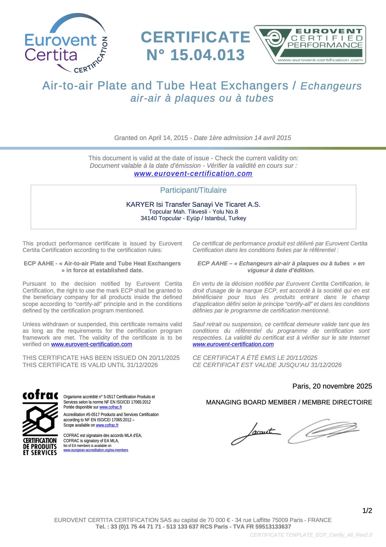 Certificat de Performance EUROVENT