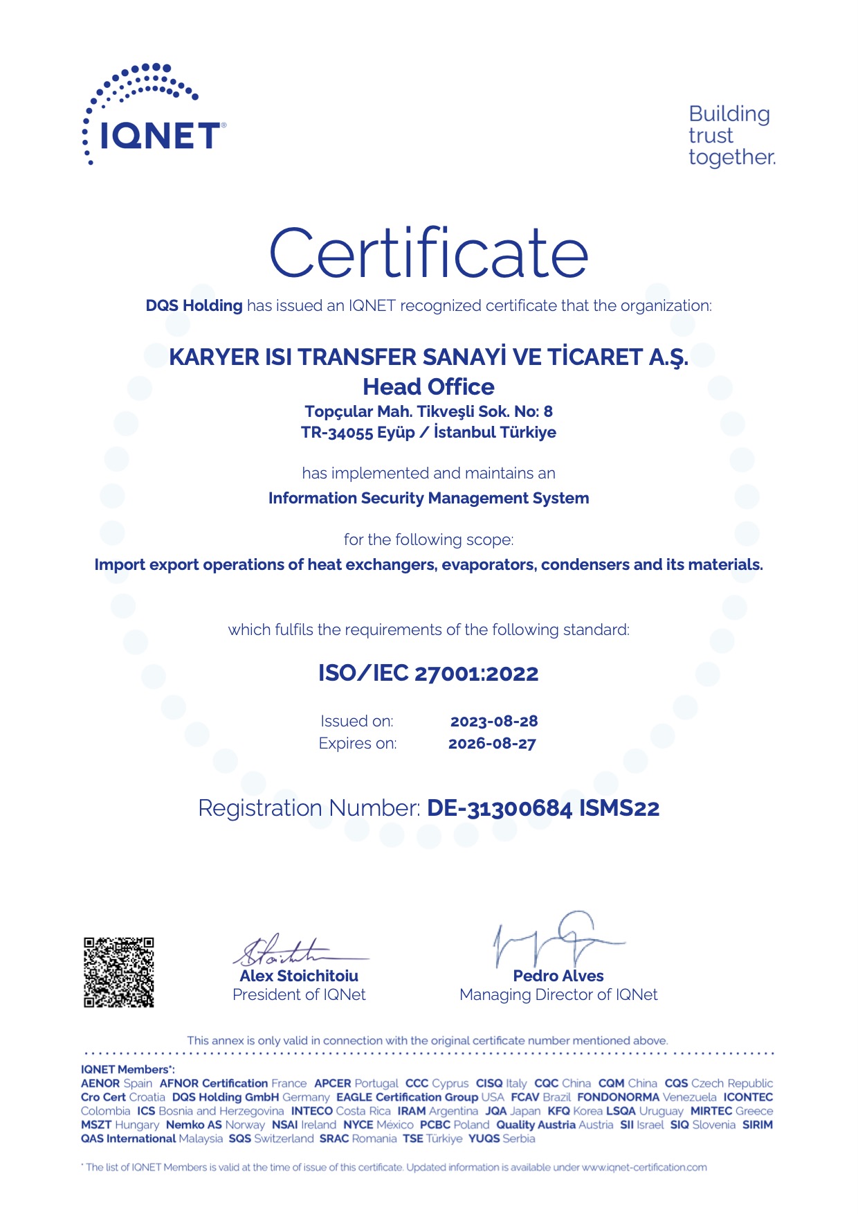 Sertifikalar Ürün ve kalite sertifikalarımızı aşağıdan detaylı inceleyebilir, bu linke tıklayarak indirebilirsiniz. UL Onaylı Komponent Serfitikası EUROVENT Performans Sertifikası ISO 9001:2015 ISO 14001:2015 ISO 45001:2018 CE 2014/35/EU CE 2014/68/EU (PED) UKR-SEPRO ISO/IEC 27001:2022 IATF 16949: 2016 Sedex Sorumlu ve Etik iş ilkeleri Uyumluluk Belgesi